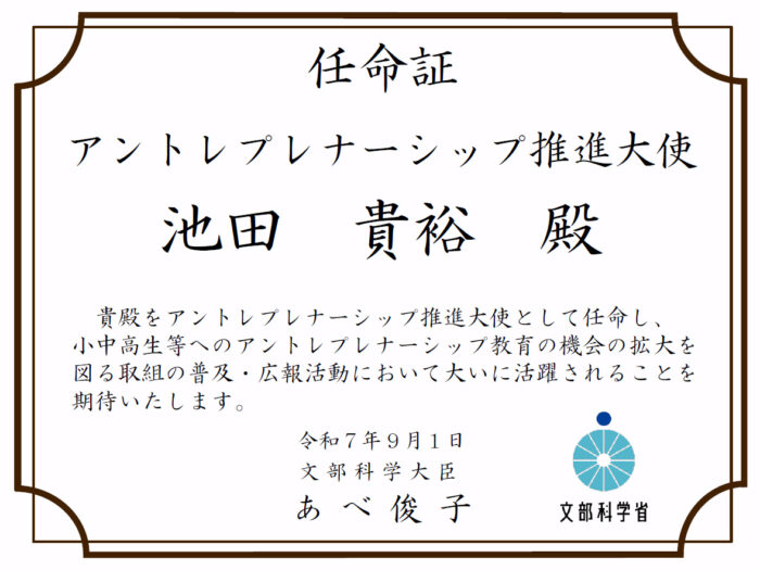 このたび、当社代表・池田 貴裕が文部科学省より「アントレプレナーシップ推進大使」に任命されました。文部科学省ではアントレプレナーシップを「新たな価値を生み出していく精神」と捉え、小・中学校、高等学校等へのアントレプレナーシップ教育を推進する機運を高めるため、ビジネスや教育現場等で活躍する「アントレプレナーシップ推進大使」の派遣を行っています。講演や授業を通して若い世代にアントレプレナーシップを浸透できるよう、積極的に取り組んでまいります。