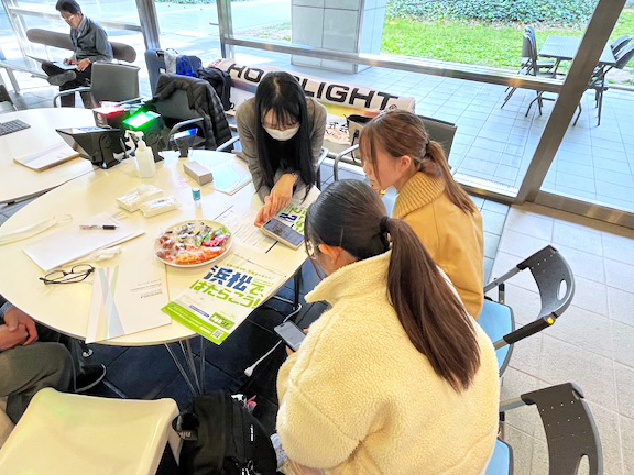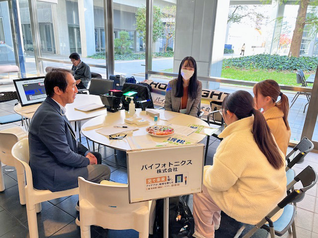 静岡文化芸術大学で開催された学内就活イベント「就Cafe」に当社も参加しました。本イベントは、スイーツを楽しみながら学生と企業が気軽に交流できる人気企画で、今年度は2回目の開催となります。当社ブースにも多くの学生の皆さんが立ち寄ってくださり、和やかな雰囲気の中でお話をすることができました。学生の皆さんからは、ものづくりや光の活用方法など、さまざまな質問をいただき、私たちにとっても非常に有意義な交流の時間となりました。今回の出会いが、学生の皆さんの新しい一歩につながれば幸いです。