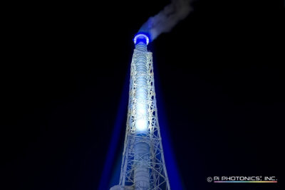 高さ約100mの巨大煙突を照射し、遠方からも視認できるダイナミックな光演出を実現