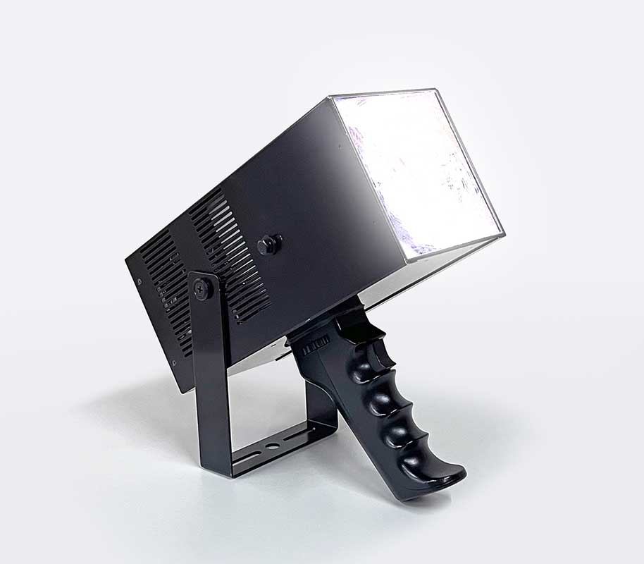 携帯型鳥害対策用LED照明「ホロライト・チェッカーズ」は市松模様(チェッカーパターン)の光を高速に反転照射することにより、人間の目には刺激が少なく、目の応答性が高い鳥には刺激を与えて、クリーンでスマートな光による追い払いを実現します。低消費電力であるために、バッテリーからの電力供給で持ち運びが可能となり、グリップにあるトリガーを引いて、簡単に遠方の狙った箇所へ光を照射することができます。