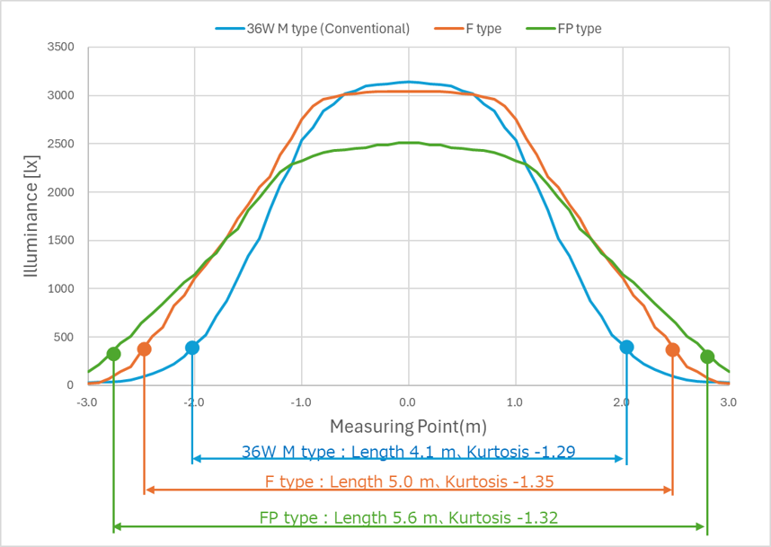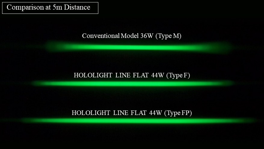 The new “HOLOLIGHT LINE FLAT” increases rated power to 44W, compared to 36W in the previous model. As a result, total luminous flux is improved by 1.18× for the type F and 1.08× for the type FP. This enhancement enables the formation of brighter linear light patterns while maintaining high visibility even in well-lit environments. Consequently, it ensures reliable safety markings in factories and warehouses and contributes to improved operational efficiency at worksites.