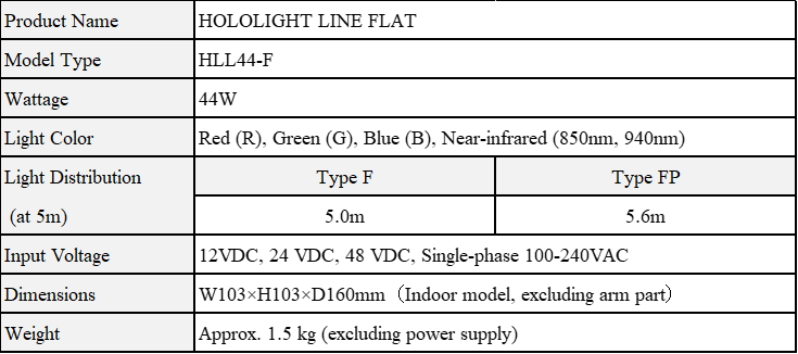 The Linear Flat Light Pattern LED Lighting “HOLOLIGHT LINE FLAT (44W)” forms a highly visible linear light pattern recognizable even from a distance. Compared to the conventional model “HOLOLIGHT LINE (36W)”, this product significantly enhances uniformity and light output, thereby improving visibility. Two types—type F and type FP—are available depending on the required linear length. In addition to three standard colors (red, green, blue), near-infrared (850nm, 940nm) variations are also included in the lineup, supporting a wide range of needs from safety measures and inspection processes to special applications.